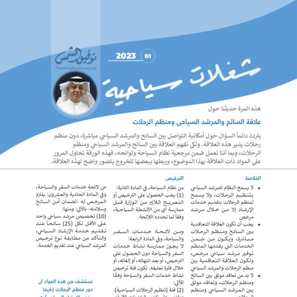 يتردد دائماً السؤال حول أمكانية التواصل بين السائح والمرشد السياحي مباشرة، دون منظم رحلات يدير هذه العلاقة. ولكي نفهم العلاقة بين السائح والمرشد السياحي ومنظم الرحلات، وبما أننا نعمل ضمن مرجعية نظام السياحة ولوائحه، فهذه الورقة تحاول المرور على المواد ذات العلاقة بهذا الموضوع، وربطها ببعضها للخروج بتصور واضح لهذه العلاقة.