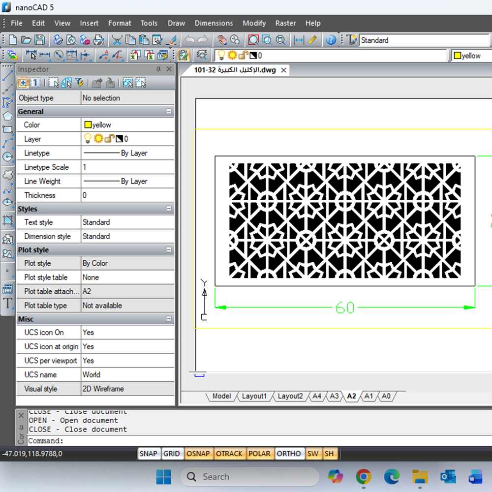 ملاحظة: ستحصلون على ملف رقمي، هندسي، بصيغة DWG، ويمكن فتحه ببرامج الرسم الهندسي مثل AutoCAD وأمثاله. هذا الملف يستفيد به المهندسون والمصممون لتحويل العمل إلى آلات الحفر بالليزر وCNC